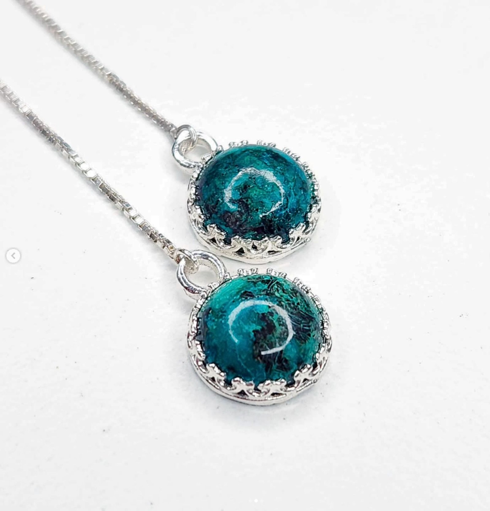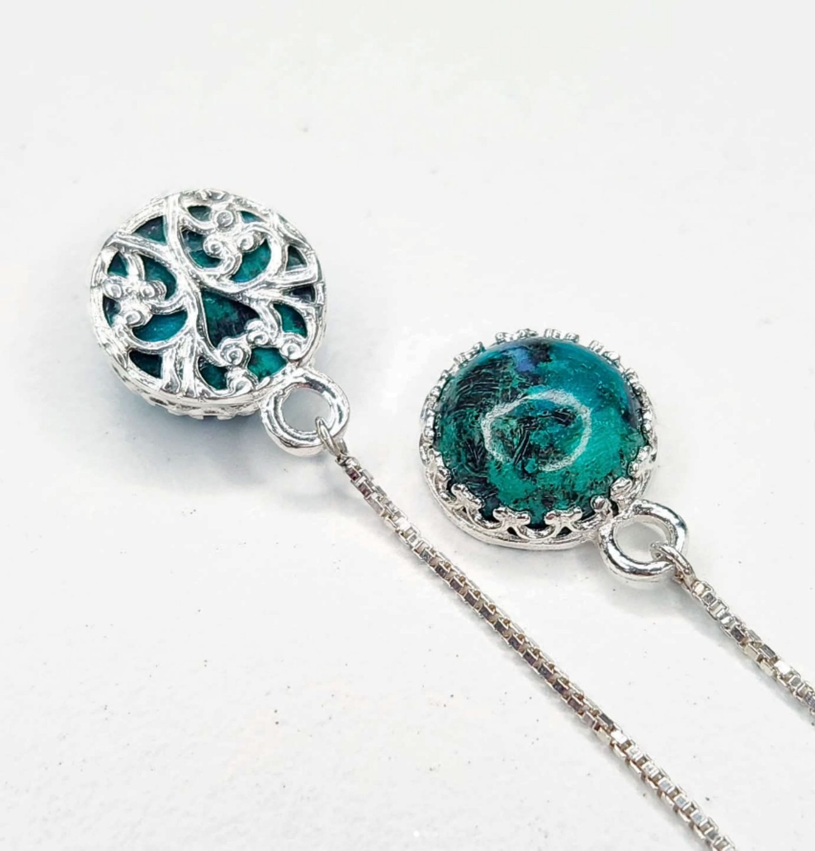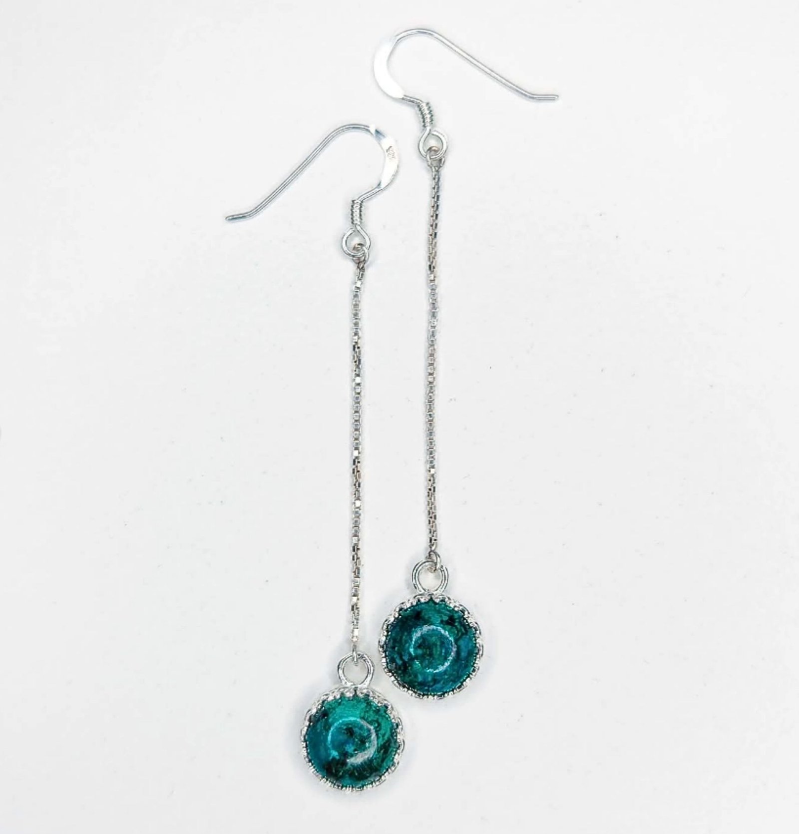 Boucles d’oreilles pendantes en argent 925/1000 et jaspes africains ronds en cabochon.