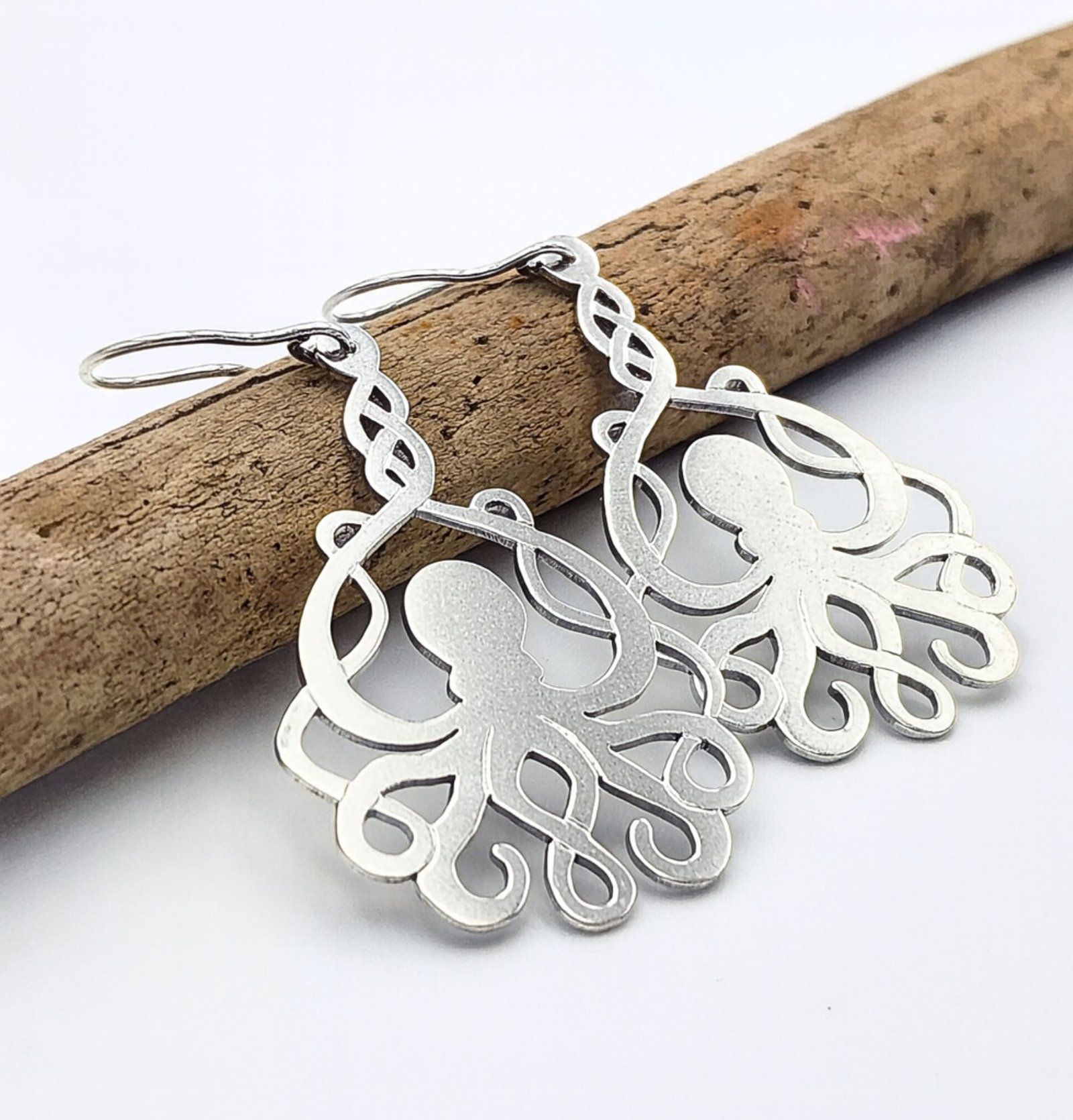 Paire de boucles d’oreilles pendantes en forme de pieuvre. Disponible en argent et en vermeil.