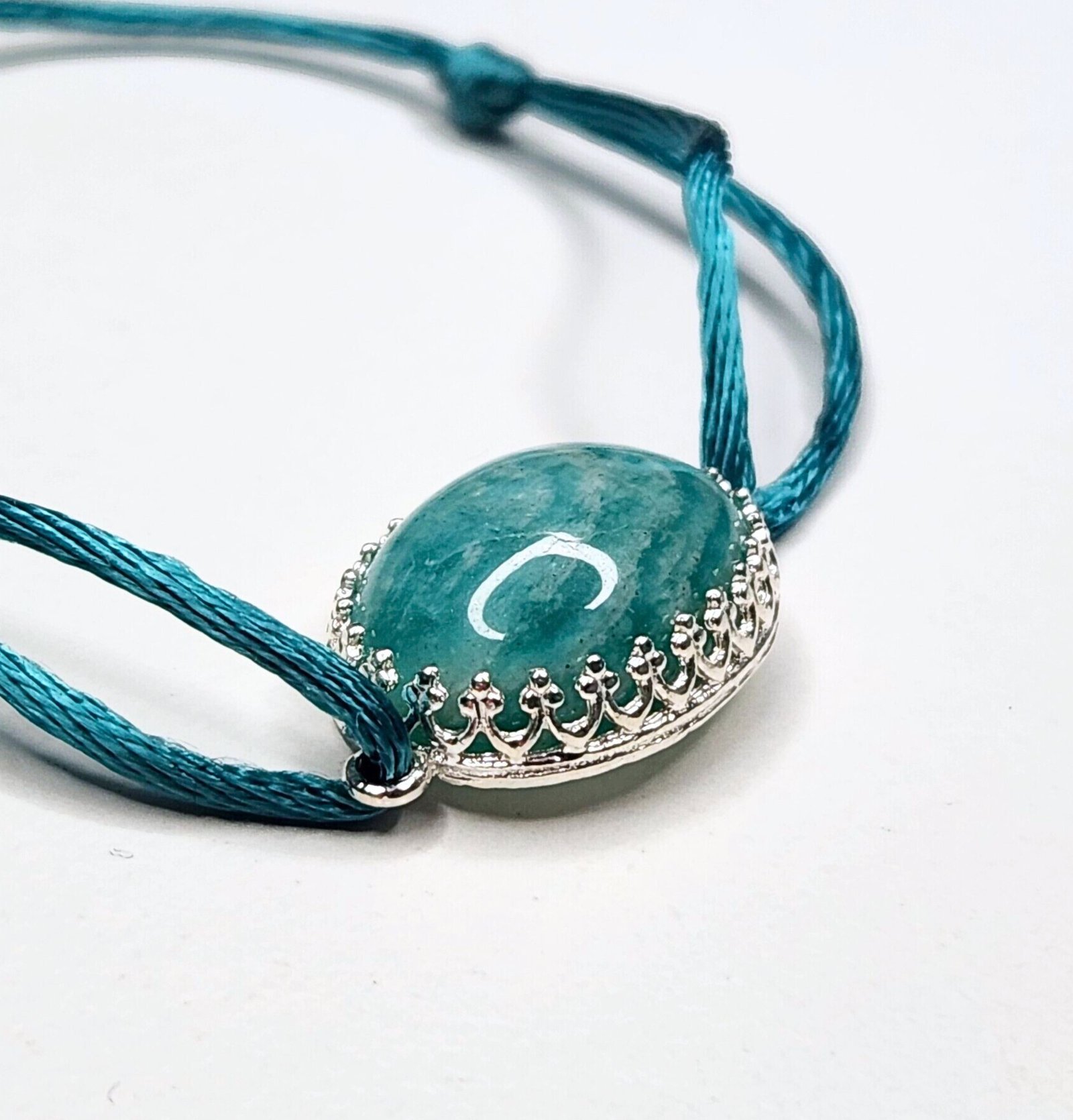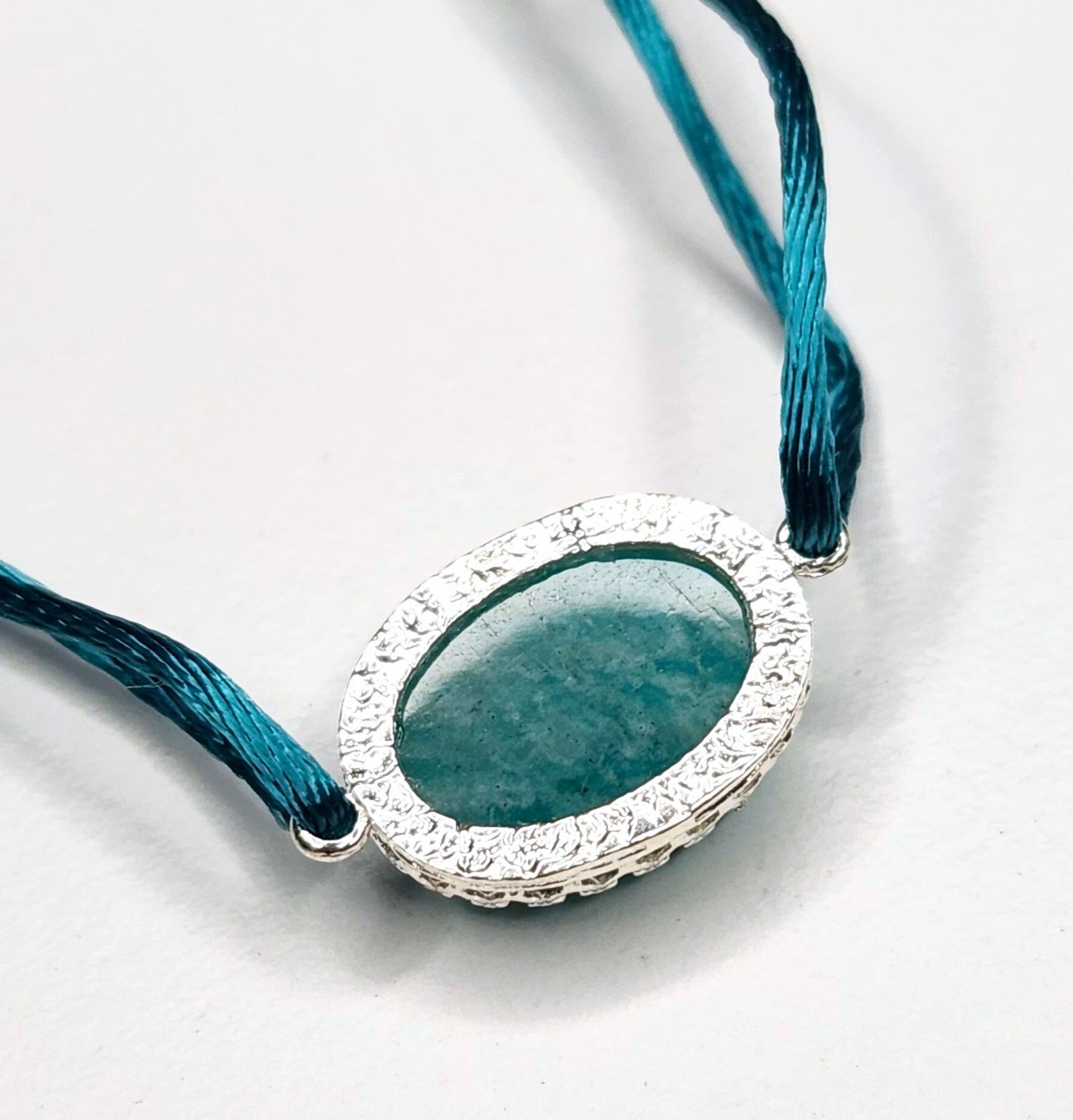 Bracelet en argent 925/1000, amazonite d’Afrique en cabochon et cordon de soie turquoise.