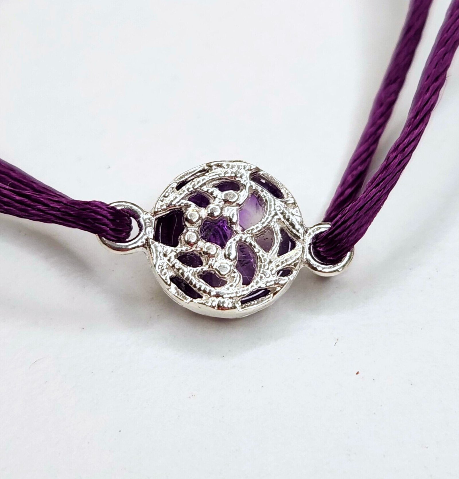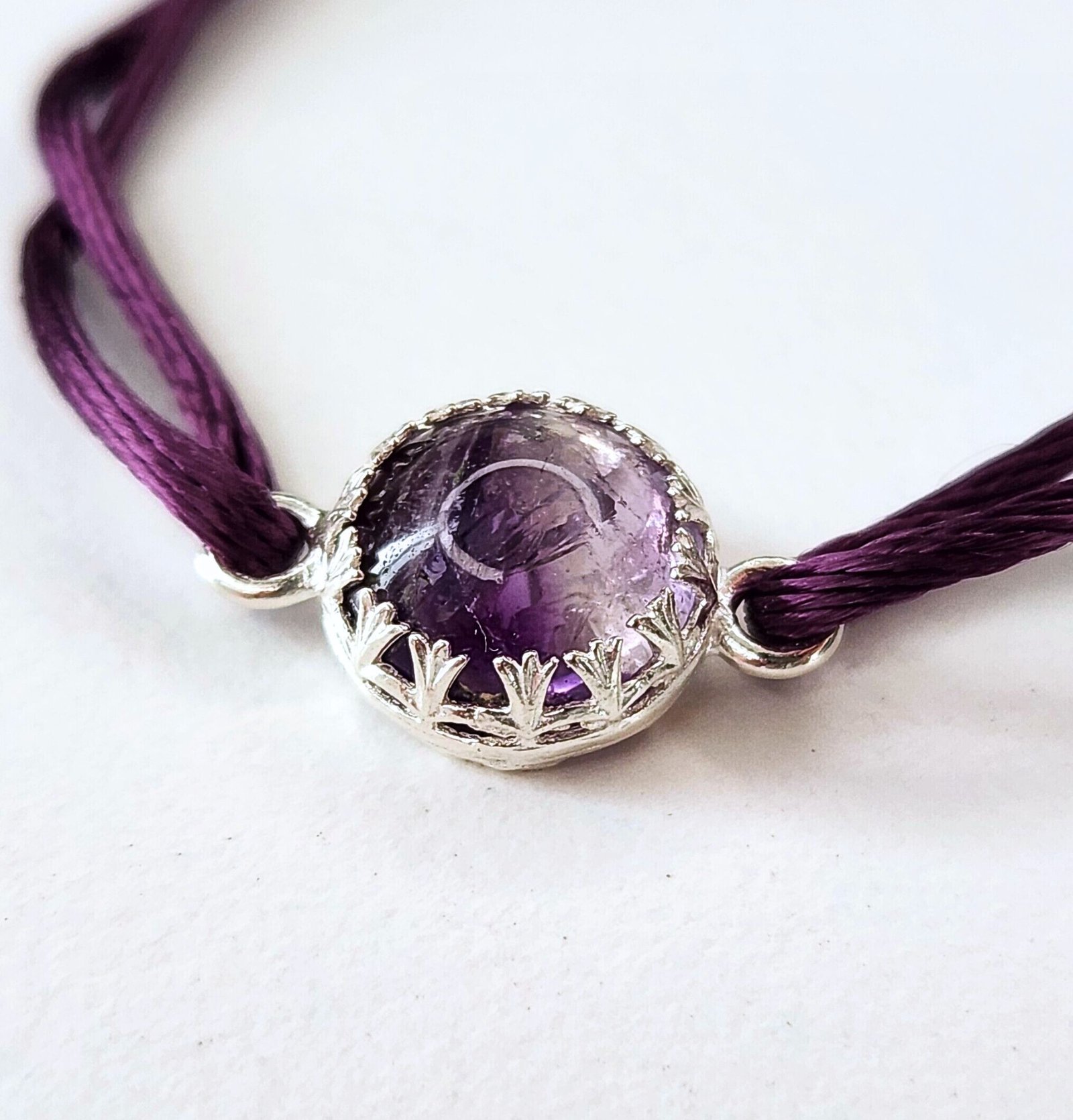 Bracelet en argent 925/1000, améthyste rutile en cabochon et cordon de soie aubergine.